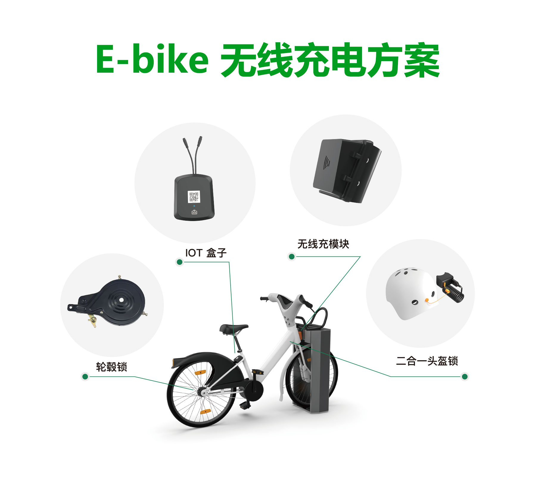 E-bike無線充電樁解決方案,多種定點停車方案,高功率充電效率,停車即刻充電,停車樁可適配品牌風格,提高品牌效益,通過軟硬件結合,實現掃碼開鎖使用,關鎖自動結費,應用GPS定位和遠程控制車輛速度,IOT內置傳感檢測報警,后臺實時監控車輛狀態,電量等信息。
